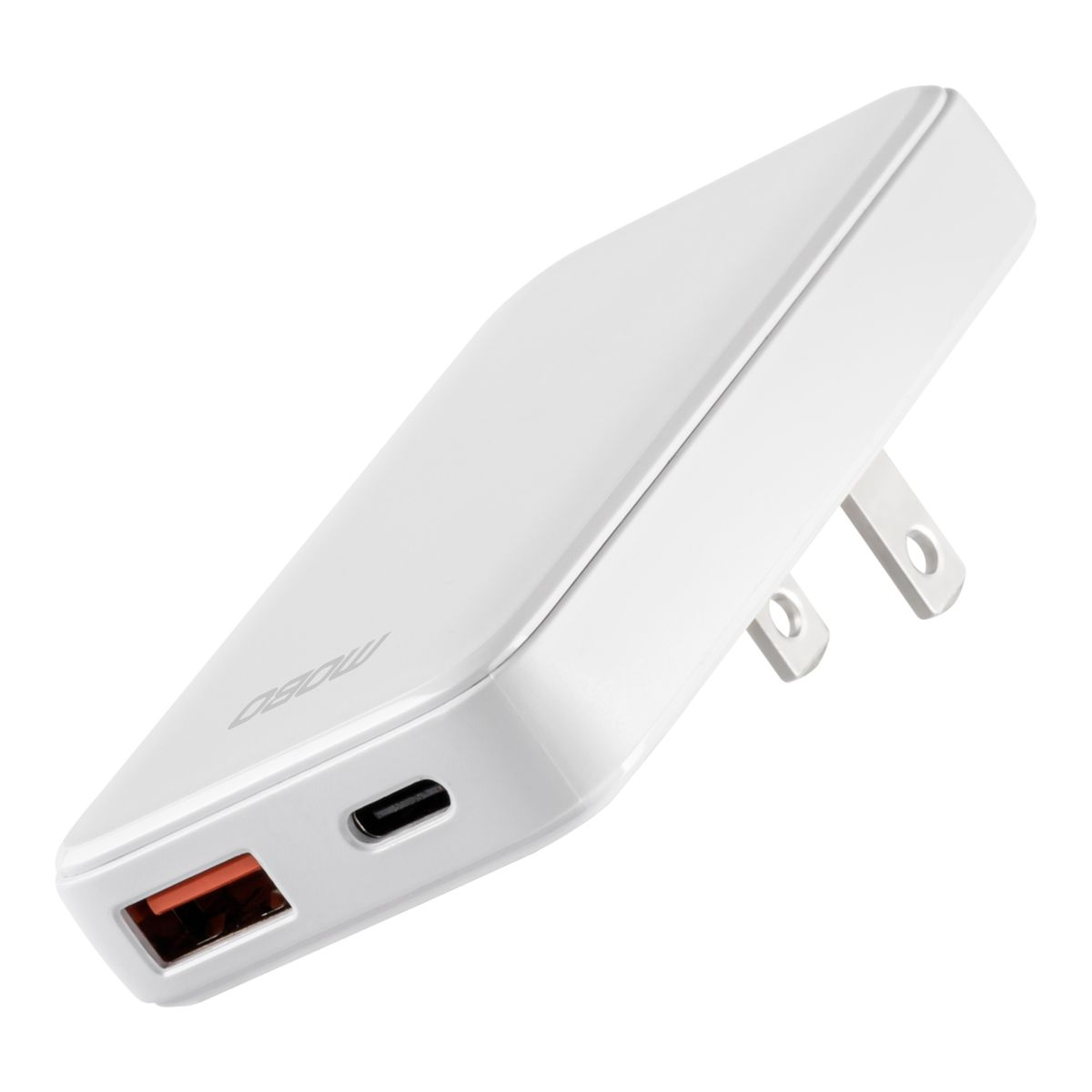 El cargador de pared Mobo Razzo blanco ofrece 33W de potencia con dos puertos (USB-A y USB-C), permitiendo cargar dos dispositivos a la vez con eficiencia y seguridad.